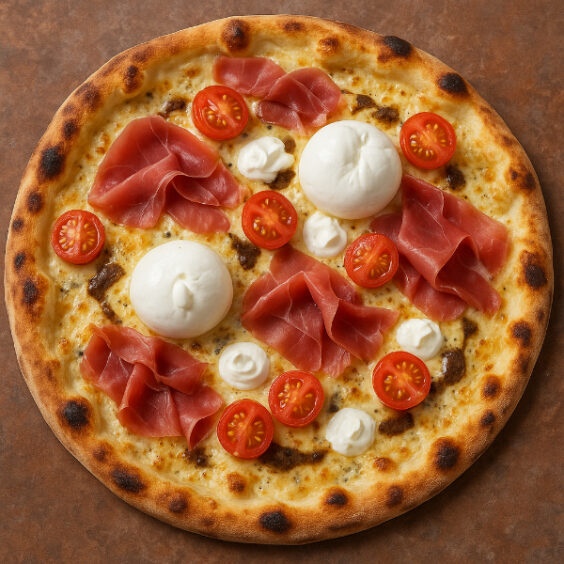 Jeder Biss ist eine Reise in die Welt feinster Aromen: Die Burrata schmilzt sanft und sorgt für ein unglaublich cremiges Mundgefühl, während die Trüffelcreme mit ihrem erdigen Duft und edlen Geschmack Tiefe verleiht. Der Rohschinken bringt eine herzhafte, leicht salzige Note, die perfekt mit der fruchtigen Süße der Cherry Tomaten harmoniert. Zusammen entsteht eine Pizza, die Eleganz und Geschmack in Perfektion vereint.