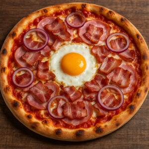 Die Rustico Pizza von Smiley’s Pizza kombiniert herzhaften „HINTERSCHINKEN“, knusprigen „BACON“, frische „ROTE ZWIEBELN“ und ein cremiges „EI“ auf aromatischer „TOMATENSAUCE“ und „MOZZARELLA“. 🍳