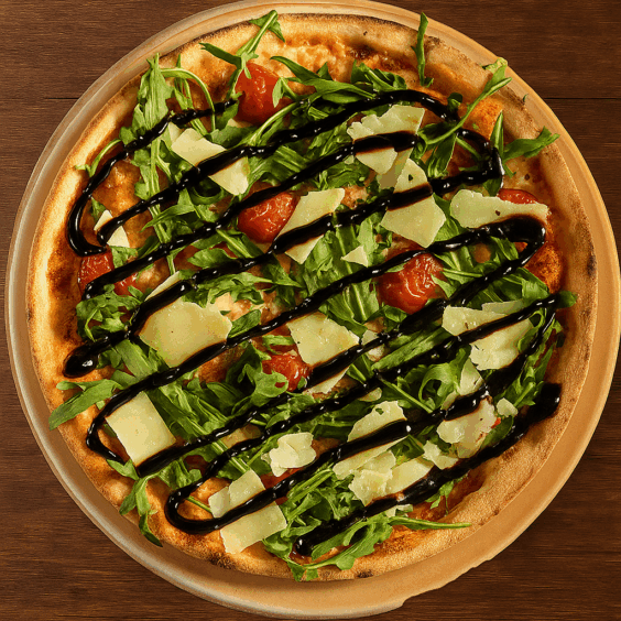 Jeder Biss dieser Pizza ist ein Stück Italien: Die scharfe Salami bringt Feuer und Würze, während der Mozzarella und die Tomaten für harmonische Milde sorgen. Der frische Rucola und der kräftige Grana Padano verleihen der Pizza einen eleganten Abschluss, der mit der süß-säuerlichen Balsamicocreme perfekt abgerundet wird.